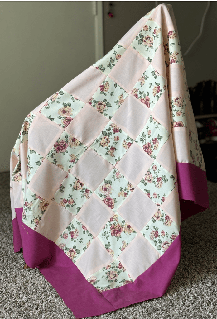 This image on the left is my first quilt, a simple, checkered design. It is made of two sheets and a dark pink pillowcase. This pink quilt is made up of seventy pink squares, seventy rose patterned squares, and eight strips of dark pink cotton. Each square is five by five inches, allowing for a quarter inch of overlap on all sides.