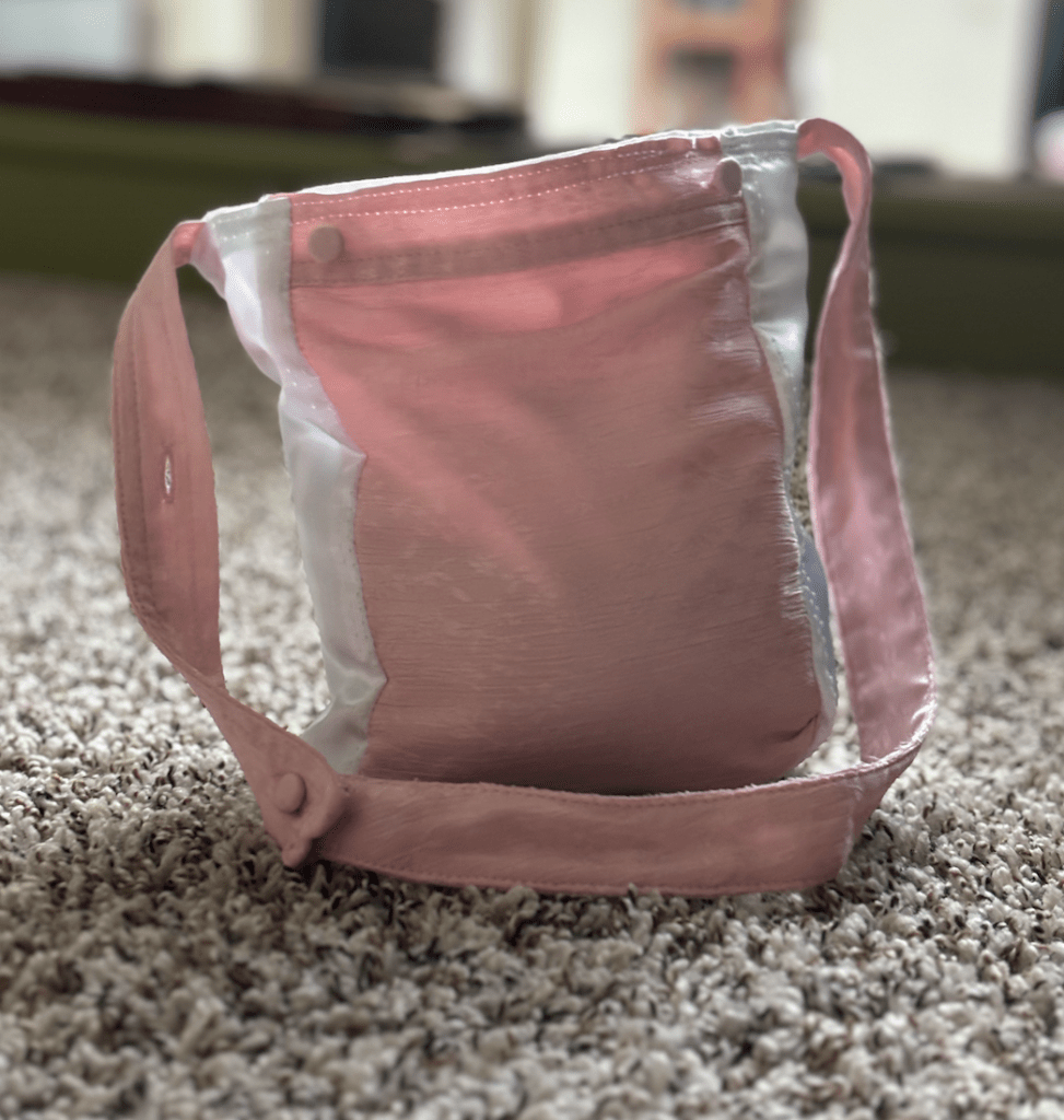 The pink and white bag is constructed from the scraps of a dress shirt and the remaining polyester blend used in the skirt. The interior is lined with 100% white cotton, which is much sturdier and holds stitches of all sizes very securely. The strap was purposely constructed from the skirt’s collar, to allow for button and unbuttoning, and for the strength of the layered fabric. This also serves as a fun reminder that the bag is a repurposed article of clothing.