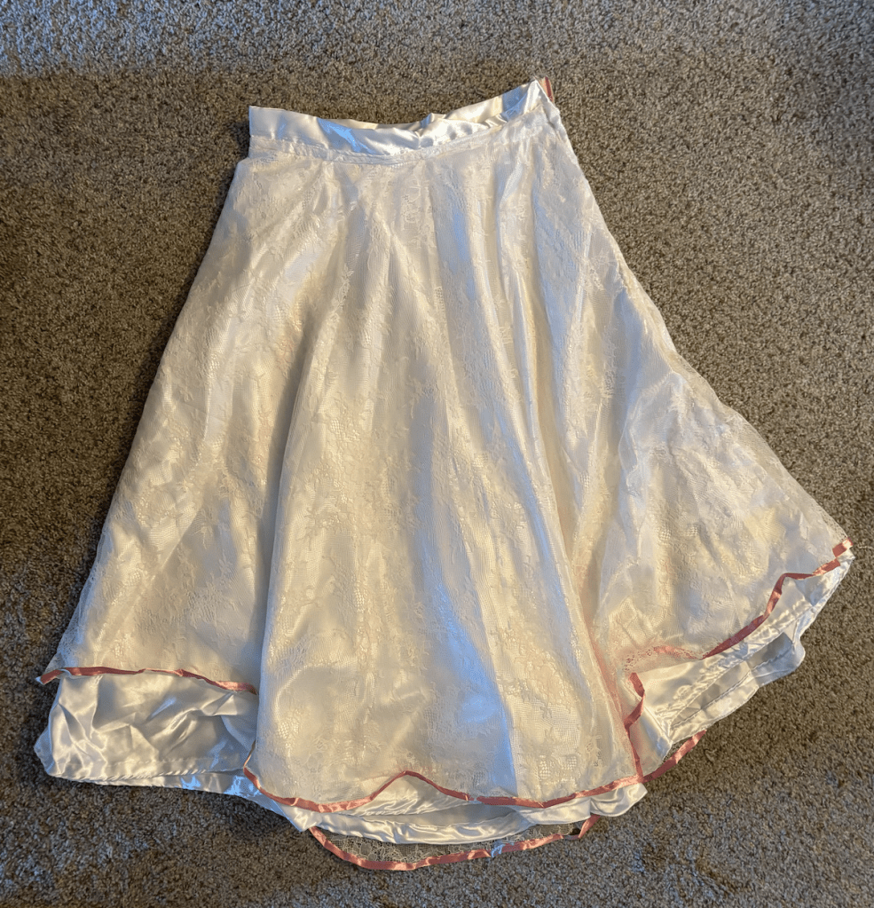 The pink and white skirt is the second article of clothing I have ever constructed. I did not follow a pattern; I investigated the strategies of self taught seamstresses for half circle skirts, measured and cut my pattern from layers of parchment paper, then cut the three layers of the skirt itself. The lace, edged with the dark pink ribbon, was hand dyed a very faint pink. It is only visible when layered over the bright white of the polyester blend of the skirt’s body. It has a functional zipper in the back and a stretchy waistband.